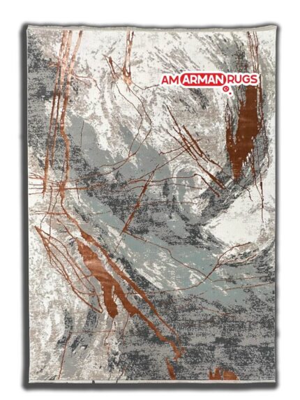 This modern rug features an abstract design with a harmonious blend of muted grey, soft off-white, and calming blue-grey tones. Dynamic coppery-brown streaks add warmth and bold contrast to the composition. Its artistic pattern makes it an ideal centerpiece for contemporary or minimalist interiors. Durable and stylish, this rug enhances any living space with a touch of elegance.